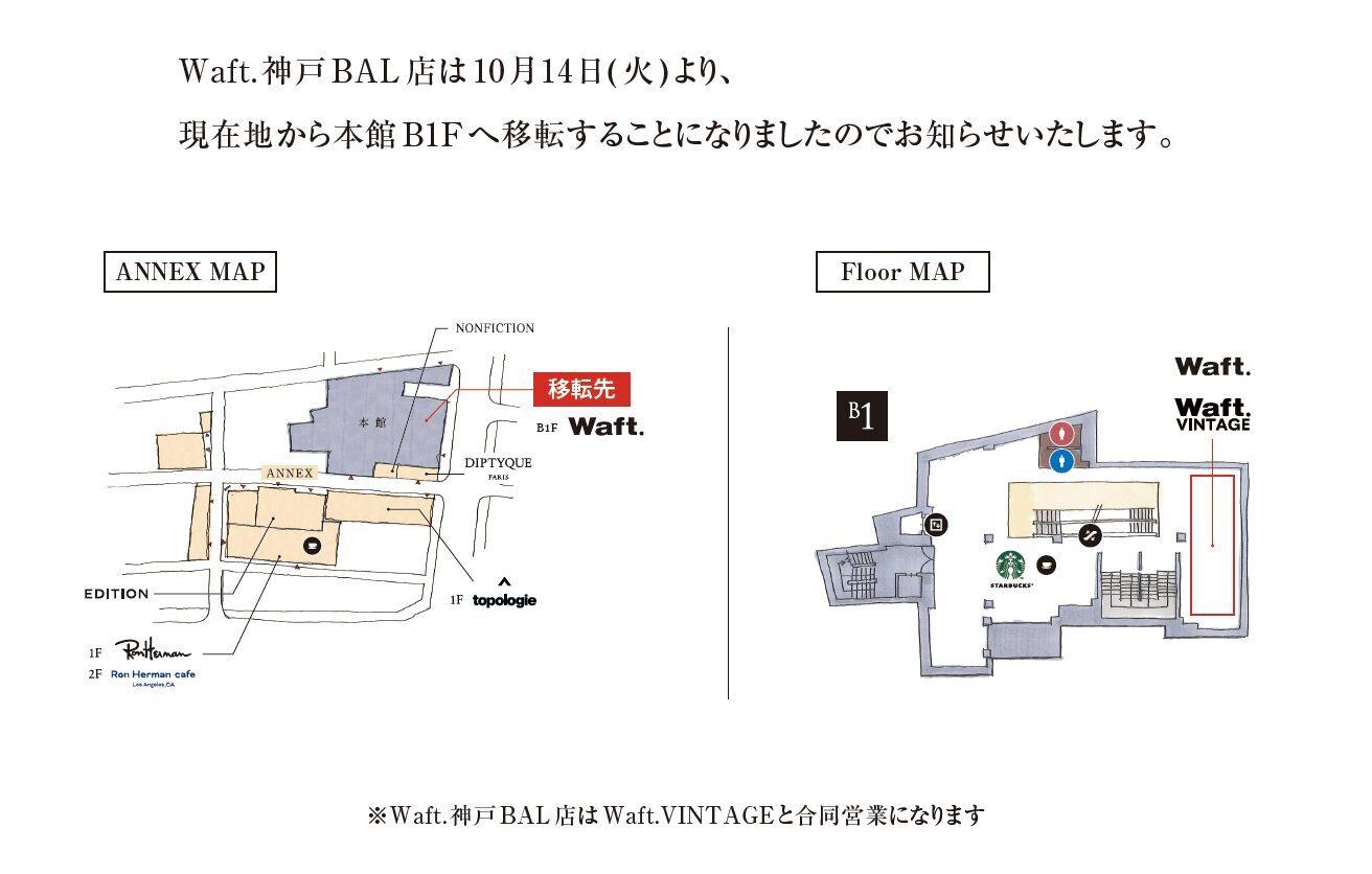 2025.10.07 News 移転のお知らせ:【Waft.】神戸BAL B1F 平素よりご愛顧いただき、誠にありがとうございます。 Waft.神戸BAL店は10月14日(火)より本館B1Fへ移転することになりましたのでお知らせいたします。※移転先:神戸BAL 本館 B1F Waft.VINTAGEと合同営業になります 移転後のご来店も心よりお待ち申し上げております。<お問い合わせ先>Waft.VINTAGE:078-331-2929